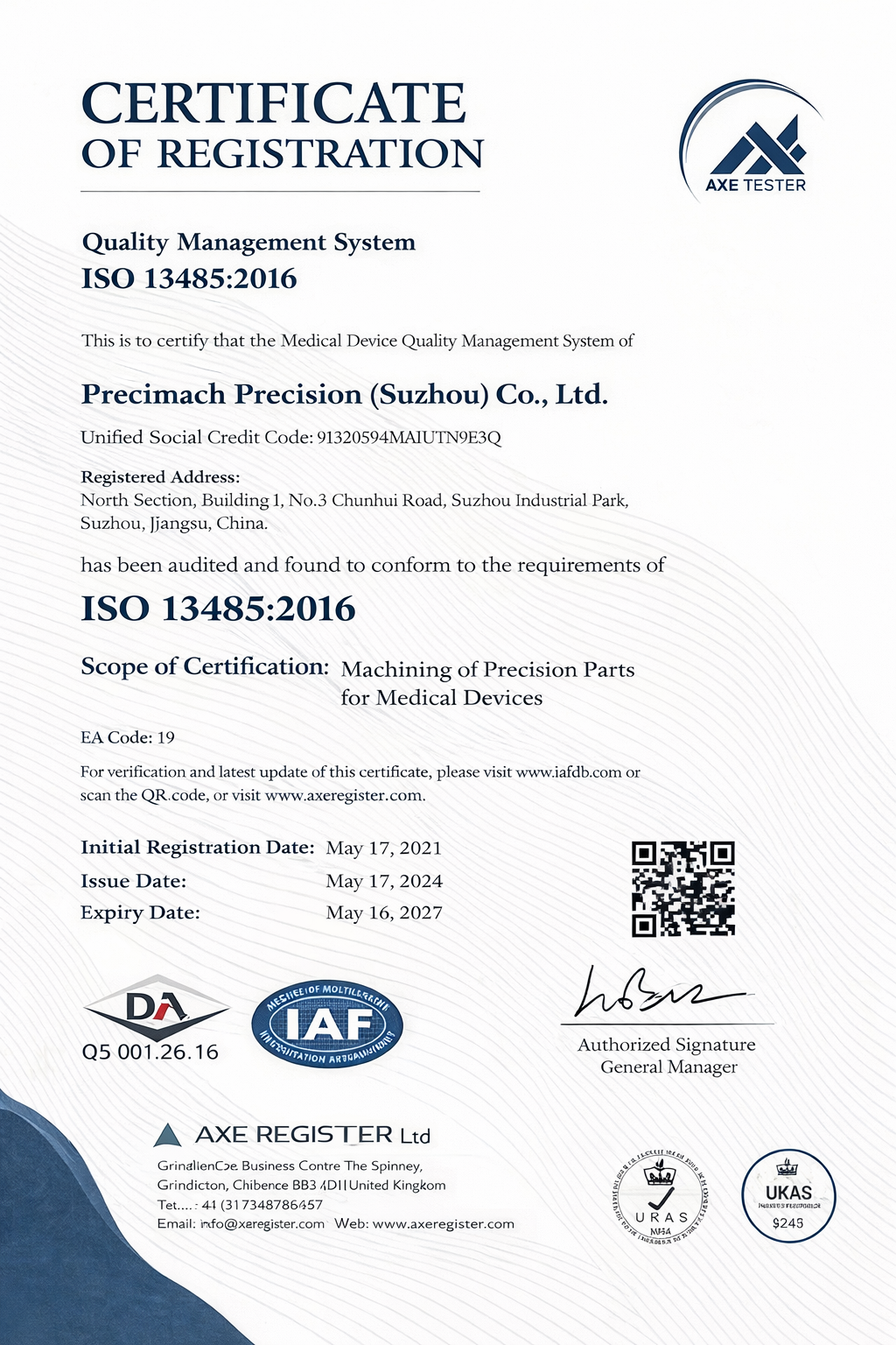 Precimach operates under a certified ISO 13485:2016 Quality Management System, specifically established for the manufacturing of precision medical components.